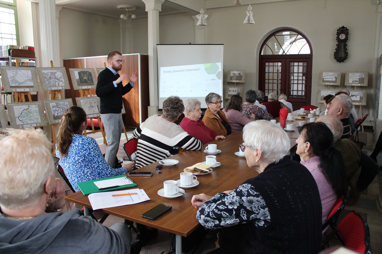 Seniorzy dowiedzieli się czym w ogóle jest Internet, kiedy powstał i do czego służył pierwotnie. Poznali zalety tej globalnej sieci, czyli: szybka i wygodna komunikacja, zdobywanie informacji, nauka online, praca zdalna, zakupy internetowe, dostęp do portali społecznościowych, słuchanie muzyki i oglądanie filmów online oraz wszelka e-administracja. Oprócz pozytywów, uczestnicy wykładu rozmawiali też o zagrożeniach jakie może nieść ze sobą korzystanie z Internetu, a są to: zagubienie relacji międzyludzkich, uzależnienie, oglądanie zachowań agresywnych, możliwość bycia prześladowanym, dolegliwości fizyczne spowodowane długotrwałym użytkowaniem oraz kradzież danych osobowych. Pan Jakub Eltman poinformował słuchaczy o tym, że aby być bezpiecznym w sieci należy tworzyć silne hasła dostępu, korzystać z zaufanych stron, nie klikać w nieznane linki i zachować ostrożność przy pobieraniu plików.