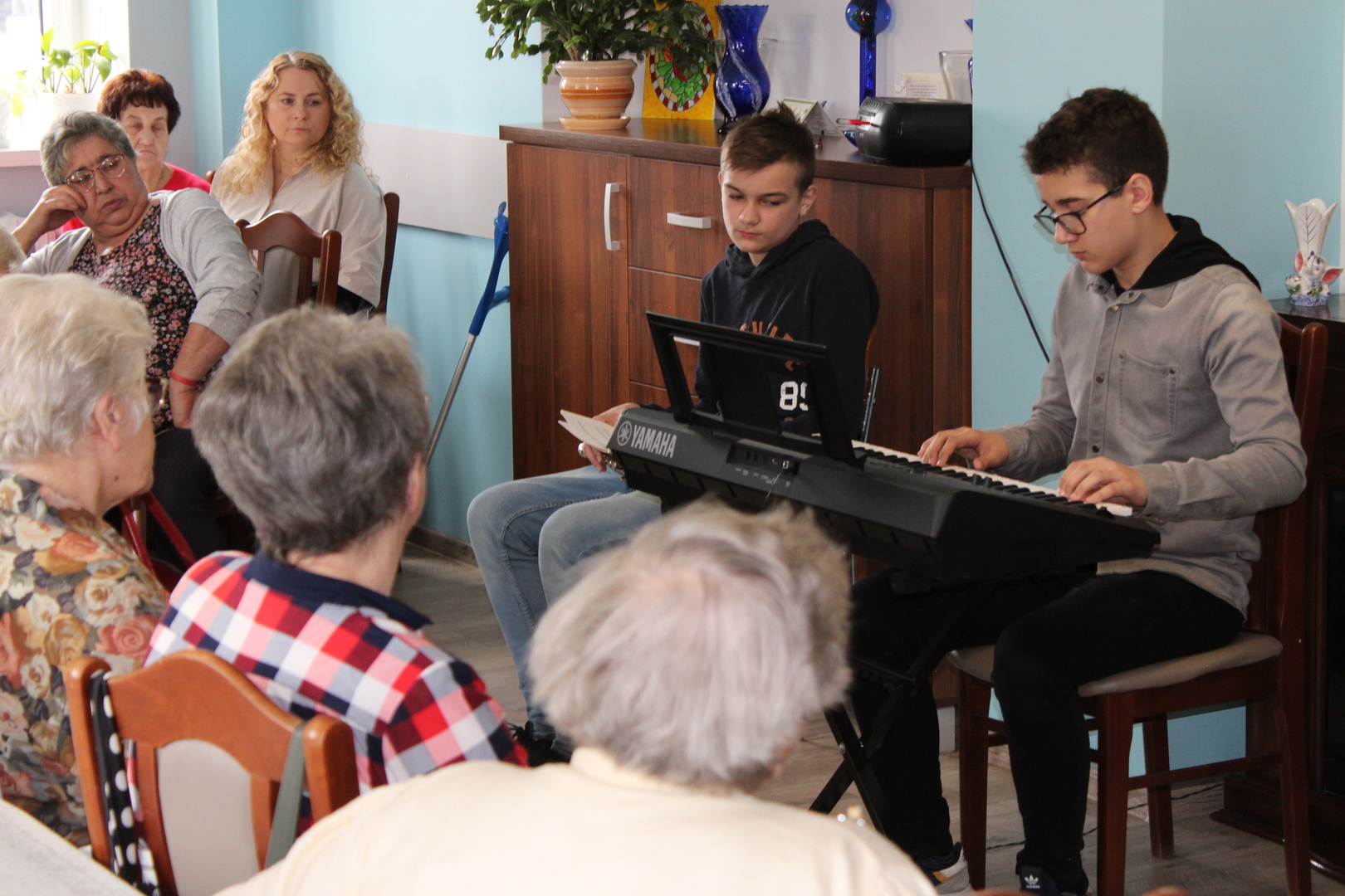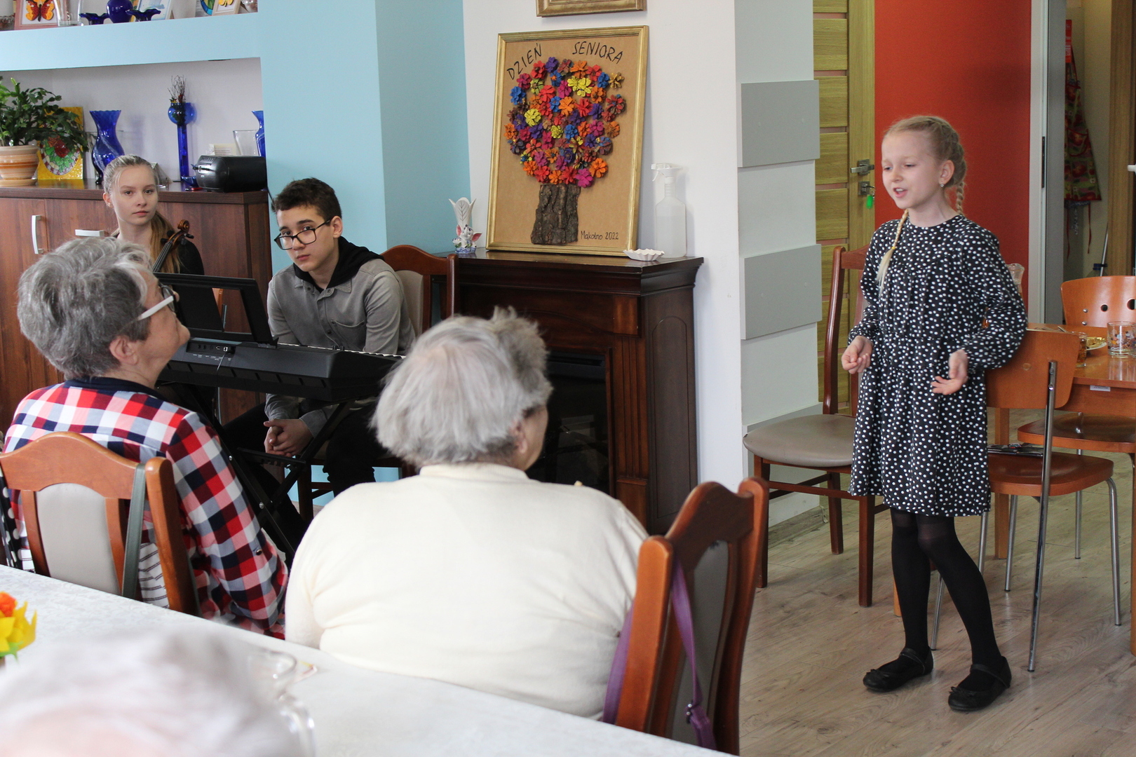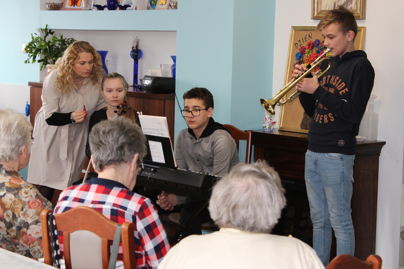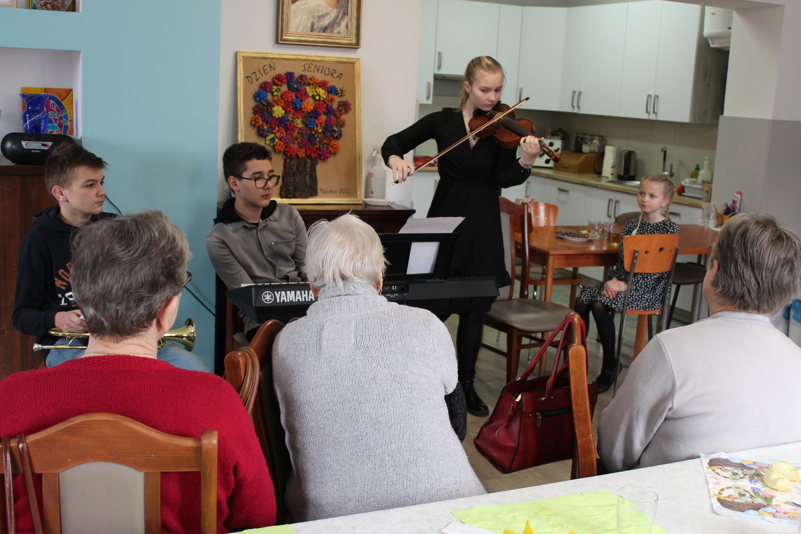 Podczas kameralnego występu nasi seniorzy mieli okazję wysłuchać piosenki pt. „Mięta” w wykonaniu Marysi Szymańskiej oraz utworów m.in.: „Lubię wracać tam gdzie byłem” na skrzypcach – Amelia Skalska; „Szła dzieweczka do laseczka” na trąbce – Jakub Bartosik oraz „Spring Waltz” w wykonaniu Mateusza Wiśniewskiego na keyboardzie.