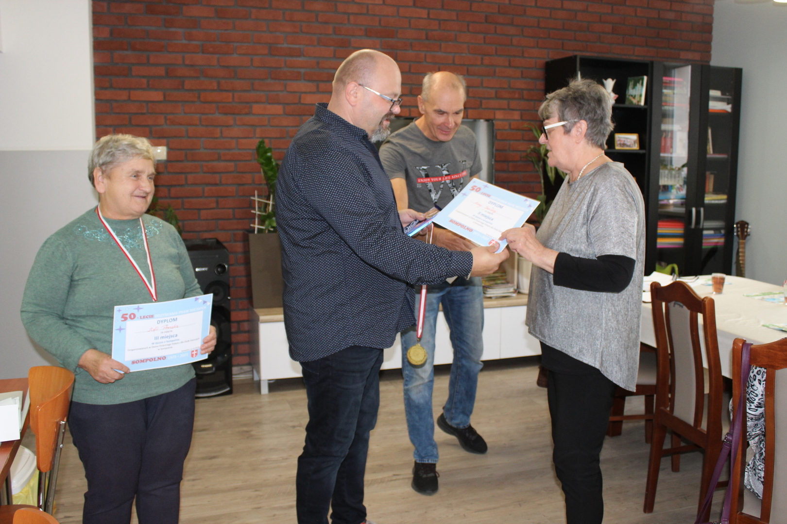 Obchody 50-lecia odzyskania praw miejskich przez Sompolno, były inspiracją do przeprowadzenia quizu na temat historii naszego miasta. Uczestnicy Domu Dziennego Pobytu dla osób starszych w Sompolnie, jak zwykle dobrze poradzili sobie z ciekawym tematem. Z odpowiedziami na pytania, że w roku 1900 powstała jednostka OSP czy, że kolej wąskotorowa do Sompolna dotarła w roku 1914 seniorzy nie mieli problemu. Bardzo dobre odpowiedzi były również w tematach dotyczących Miejsko – Gminnej Biblioteki Publicznej, Miejsko – Gminnego Ośrodka Kultury czy Gminnego Klubu Sportowego. Wdzięczny temat po raz kolejny wpłynął na miłą atmosferę podczas quizu. Rozmowy po zajęciach zrodziły ciekawe dyskusje dotyczące życia w Naszej Małej Ojczyźnie, naszych rodziców, dziadków i pradziadków. Upominki dla laureatów w dniu 12 października 2023 roku wręczył Pan Tomasz Majewski - Dyrektor Miejsko Gminnego Ośrodka Pomocy Społecznej w Sompolnie. Okolicznościowe medale, dyplomy i słodkie pyszności otrzymali: Zygmunt Teodorczyk, Anna Janicka oraz Zofia Perszka. Wszystkim serdecznie gratulujemy!!!