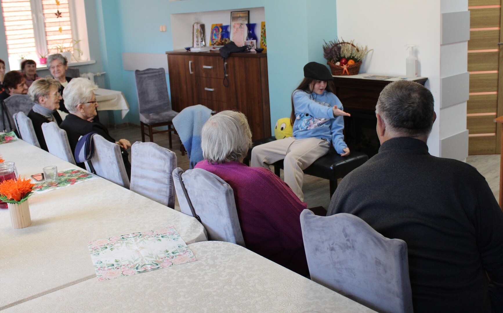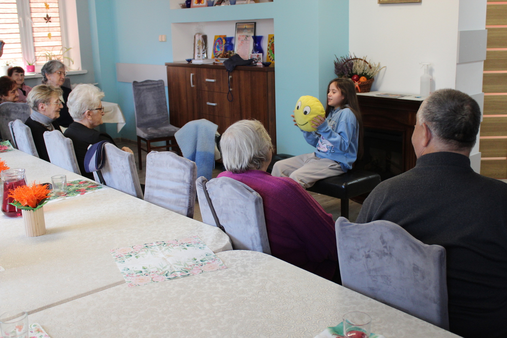 W dniu 02.12.2024r uczestnicy Domu Dziennego Pobytu dla Osób Starszych w Sompolnie mieli przyjemność gościć Melanię Żywanowską, uczennicę klasy V z Zespołu Szkolno –Przedszkolnego im. Pierwszej Kadrowej w Mąkolnie. Dziewczynka podczas zajęć teatralnych w Miejsko Gminnym Ośrodku Kultury im. Sabiny Graczyk w Sompolnie uczy się dykcji, charyzmy oraz obycia ze sceną. Pod okiem Pana Andrzeja Prętnickiego rozwija swoją pasję i umiejętności sceniczne.