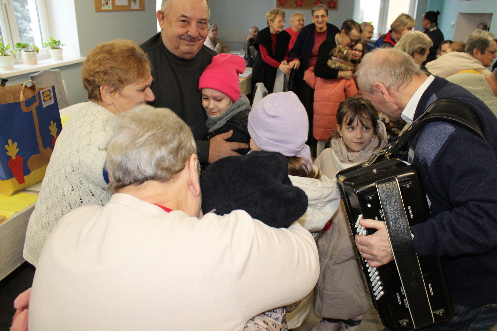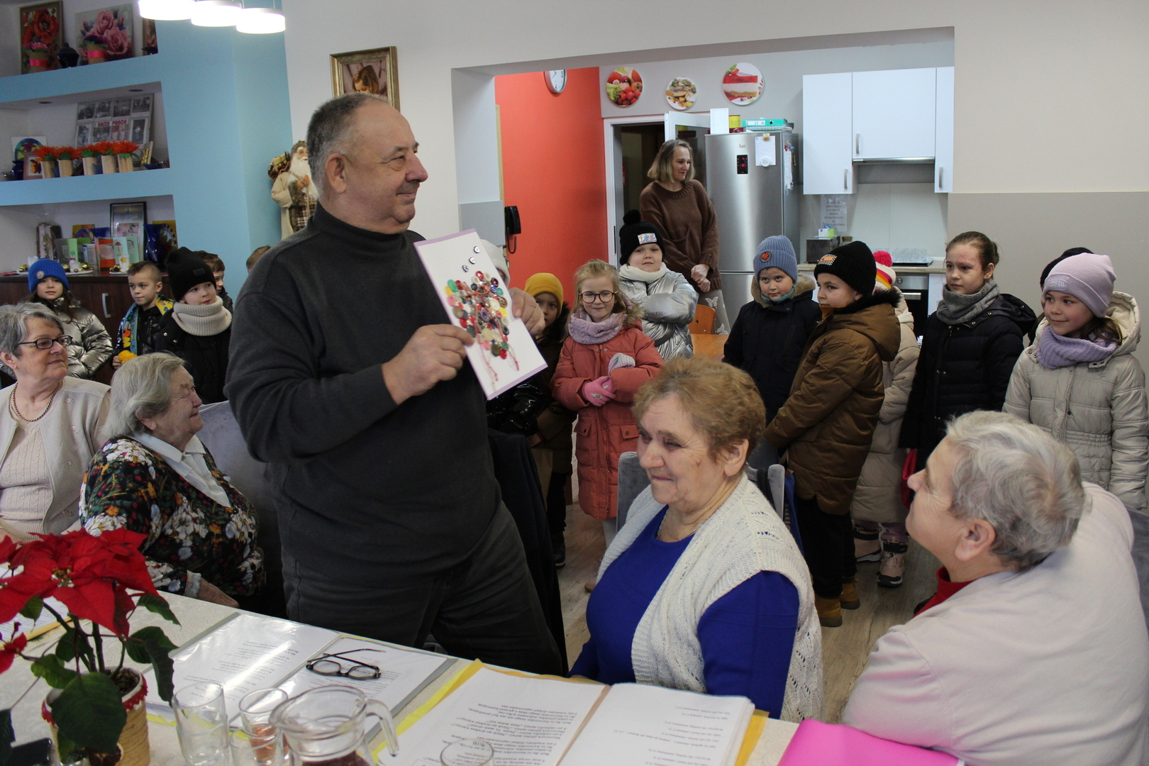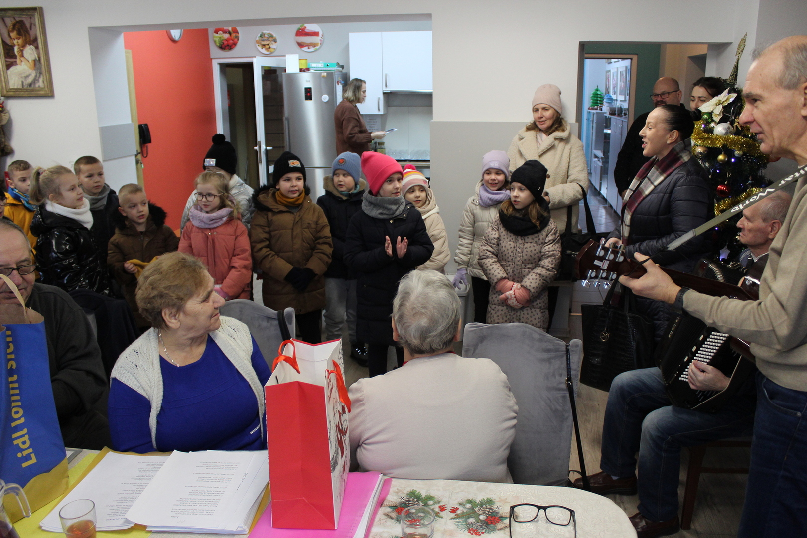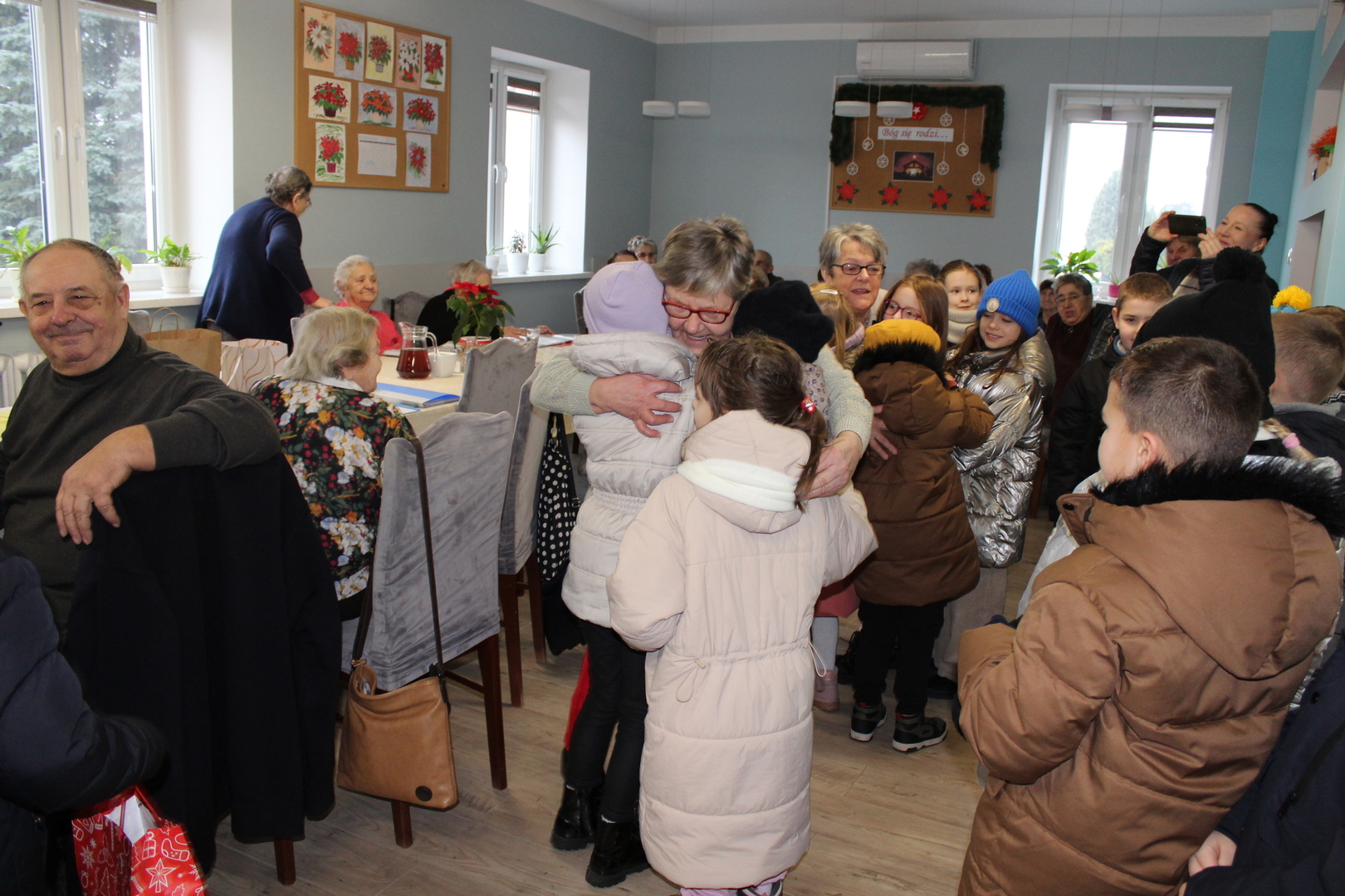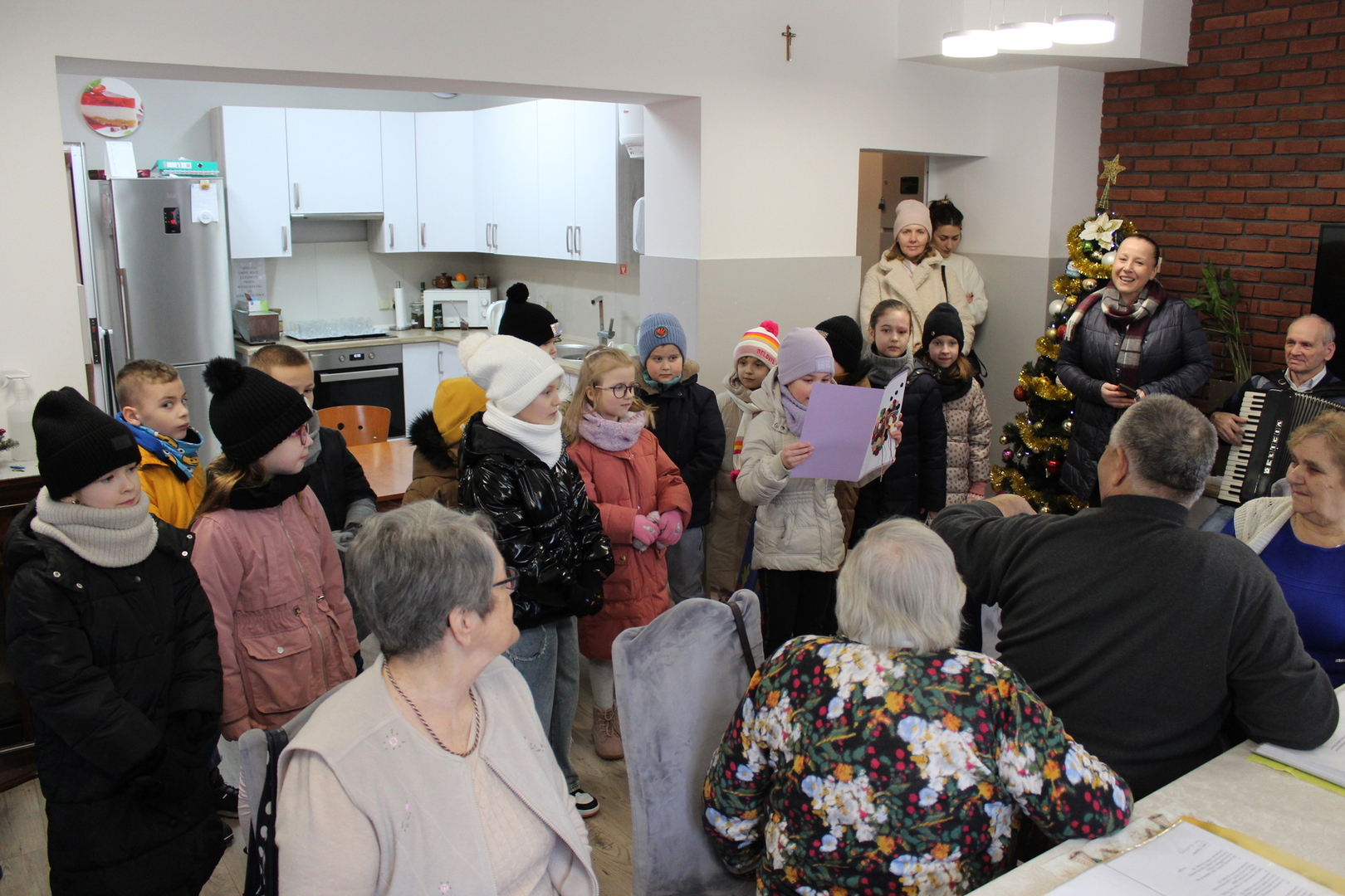Dzieci wraz z wychowawczynią – Panią Katarzyną Wiaderkiewicz oraz Panią Anetą Kostrzewską – pedagogiem szkolnym, przekazały seniorom upominek w postaci przyborów kreatywnych. Zostały one zakupione z dochodu ze sprzedaży ozdób świątecznych i decyzją dzieci, ich rodziców oraz wychowawczyni, przekazane na potrzeby DDP. Pierwszoklasiści złożyli też seniorom życzenia z okazji zbliżającego się Dnia Babci i Dziadka i wspólnie zaśpiewali kolędę.