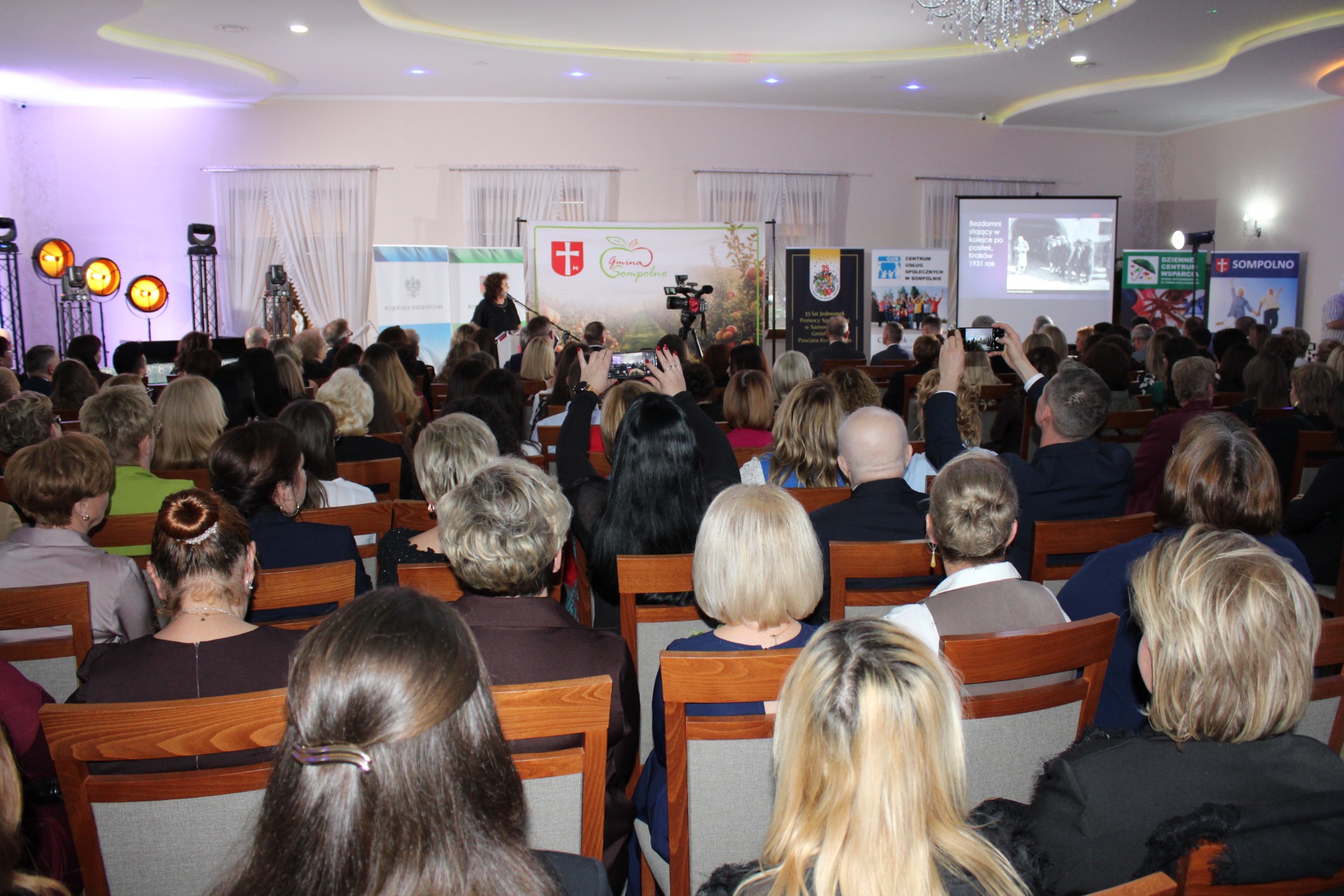 „Na początku wieku XX podczas wielkiego kryzysu w Stanach Zjednoczonych utworzono federalny system opieki społecznej, później w roku 1935 uchwalono ustawę o ubezpieczeniach społecznych, tworząc podstawy krajowego systemu.W Polsce przełomowym czasem dla poprawienia bytu społecznego był akt prawny z roku 1923 rozwijający system instytucjonalny. Po roku 1989 dokonano znaczących reform, okres III Rzeczypospolitej dokładnie rok 1990 to nacisk na rozwój pracy socjalnej”. Liczne delegacje przybyłe na świetnie zorganizowane spotkanie składające się z Burmistrzów, Wójtów, Dyrektorów, Kierowników i Liderów wszystkich Gmin Powiatu Konińskiego również z uwagą wysłuchały i obejrzały film pokazujący wycinek pracy ośrodków pomocy społecznej z naszego regionu. Niecodzienny Jubileusz to najlepsza okazja do podziękowań i wyróżnień. Główny realizator wydarzenia wielokrotnie odznaczany w tym dniu Dyrektor MGOPS w Sompolnie Tomasz Majewski w towarzystwie władz Powiatu Konińskiego, Starosty Katarzyny Fryzy, Przewodniczącej Rady Żanetty Matlewskiej oraz władz miasta Sompolno Burmistrza Waldemara Marciniaka oraz Sekretarz Urzędu Anety Niestrawskiej nagradzali i dziękowali zasłużonym pracownikom wszystkich jednostek pomocy w regionie Konińskim. Podczas tej uroczystości Pani Starosta Katarzyna Fryza wręczyła również odznaczenia „Zasłużony dla Powiatu Konińskiego” dla Pani Grażyny Nowak, Pani Marii Mila, Pani Małgorzaty Jarlaczyńskiej oraz Pana Tomasza Majewskiego.